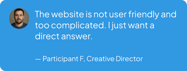 This qualitative data was alarming. Users felt the site was "untrustworthy" and "too complicated." Two quotes captured the sentiment perfectly: