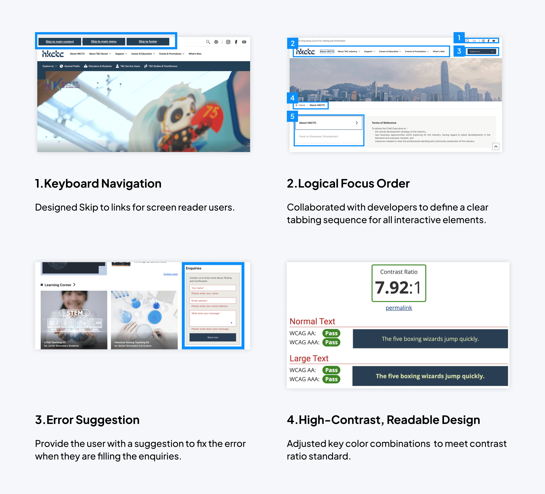 Full WCAG 2.1 AA compliance was independently validated by Gate, a social enterprise under the Hong Kong Blind Union. Their audit involved blind testers using screen readers to successfully navigate over 60 pages of the live website.