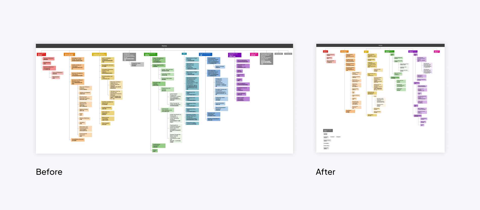 The original site had over 12 top-level navigation items, creating a confusing and overwhelming experience for users. Through card sorting and user analysis to streamline the user needs and client requirements, I consolidated the complex structure into 6 intuitive, user-centric categories. This new, simplified IA proves that users can now find what they need quickly and without frustration.