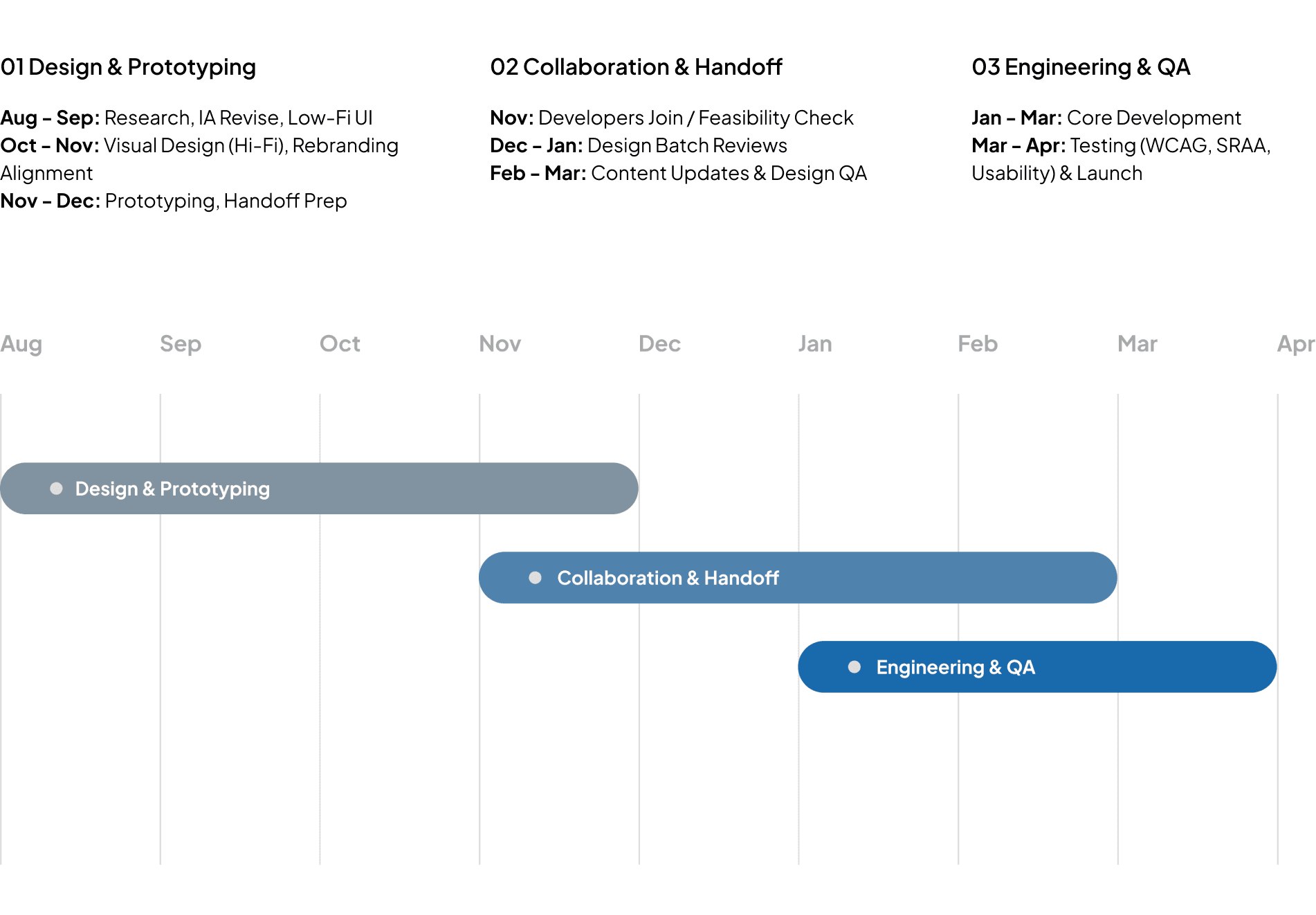 The project was bound by strict, non-negotiable government standards for security and accessibility (e.g., WCAG 2.1). This meant every design decision, from component choice to user flow, had to meet these technical criteria from the outset, forcing a "compliance-by-design" approach.